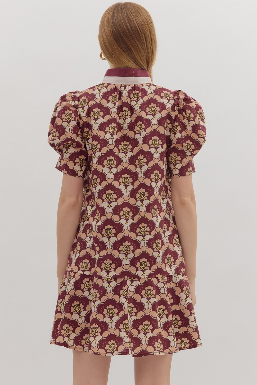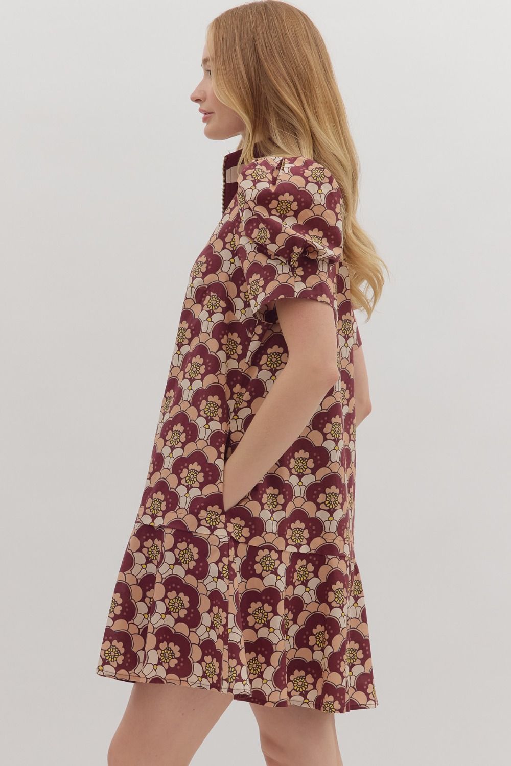 Retro floral print short puff sleeve mini dress featuring contrast trim half-zip collar. Pocket at side. Ruffle hem. Lined. Woven. Non-sheer. Lightweight.