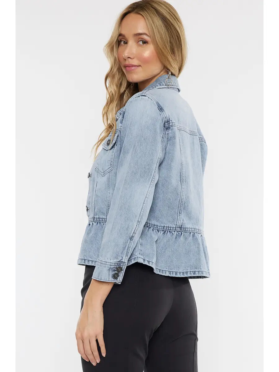 Classic fit, peplum, denim jacket. Light stone wash, Rigid 21" length in size m.