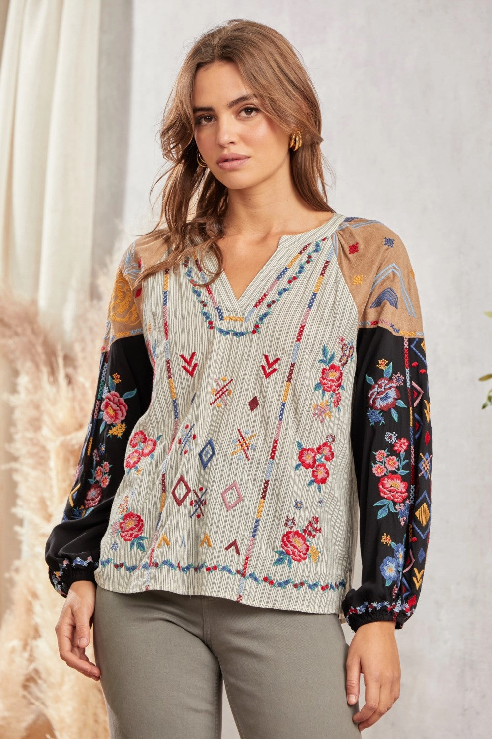 Mix media embroidered top with split neckline and contrast panel sleeves.