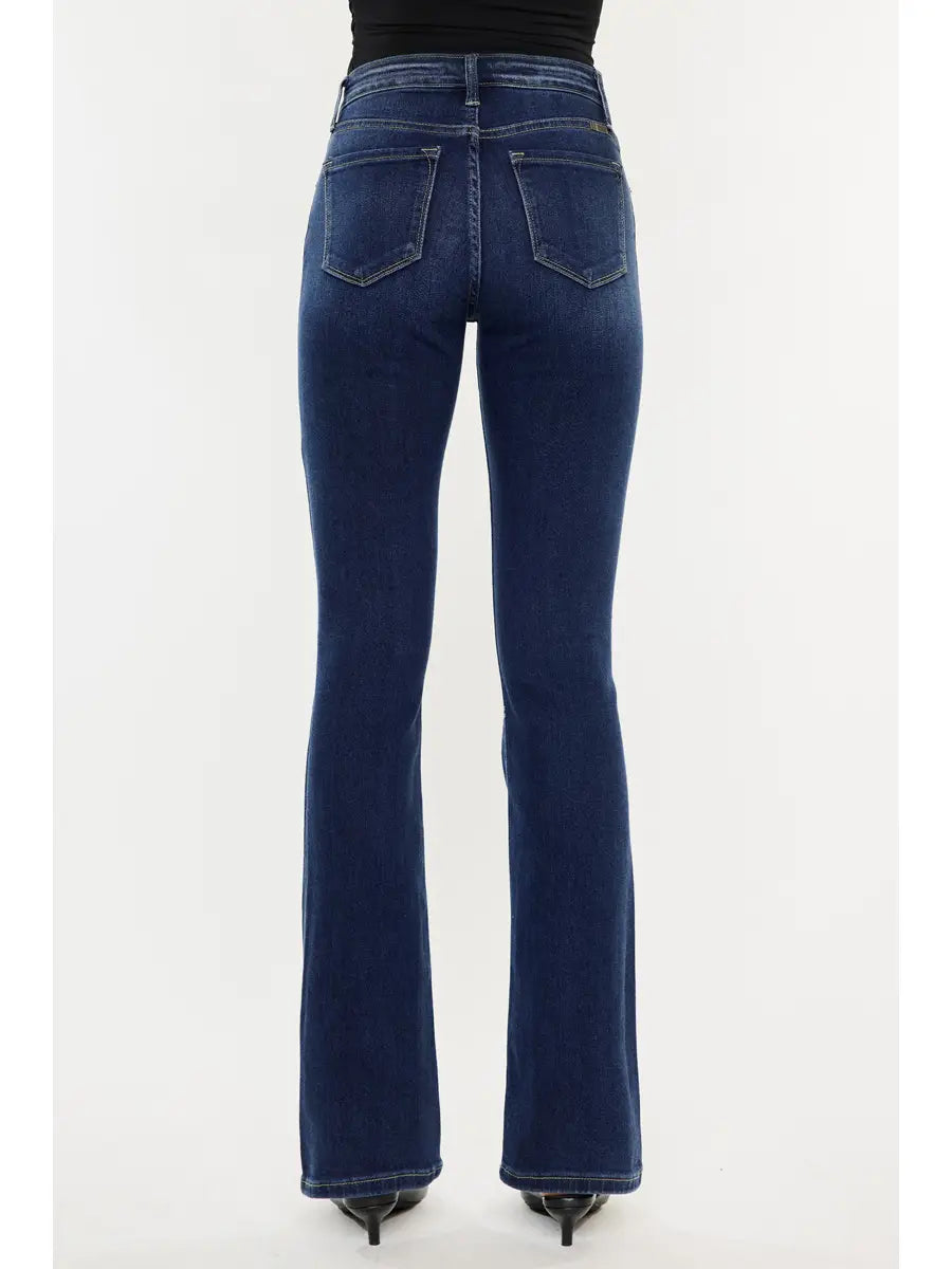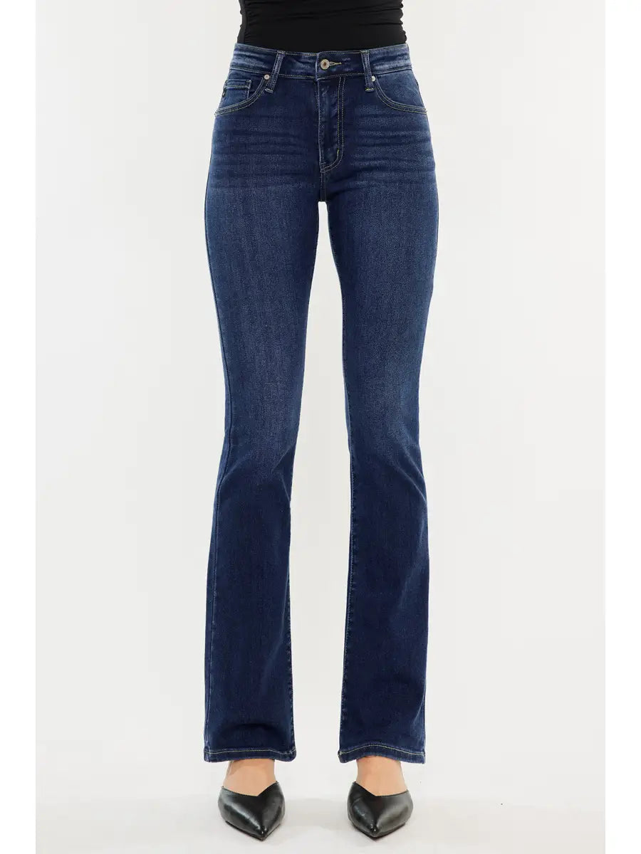 Highrise bootcut jeans. Dark wash, Stretch. Non distressed, 5 pocket style, Zipper fly jean. 8" leg opening Rise 10” inseam 32“ in size 5/26